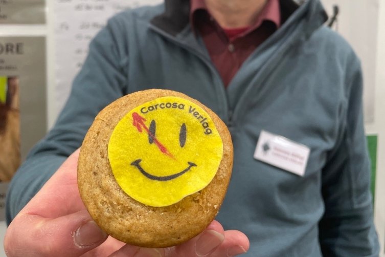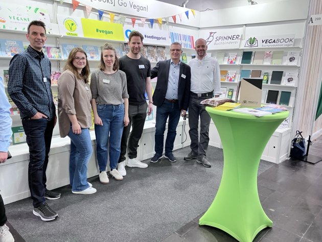 Die Vermarktungsgesellschaft für das V-Label (das vegane Produkte kennzeichnet), der vegane Kinderbuchverlag, das Druckhaus oeding print und die Buchbinderei Spinner, die Bücher mit veganem Leim binden kann, teilten sich einen Messeauftritt in guter Lage in Halle 3. Die Nachfrage nach Informationen war entsprechend gut.