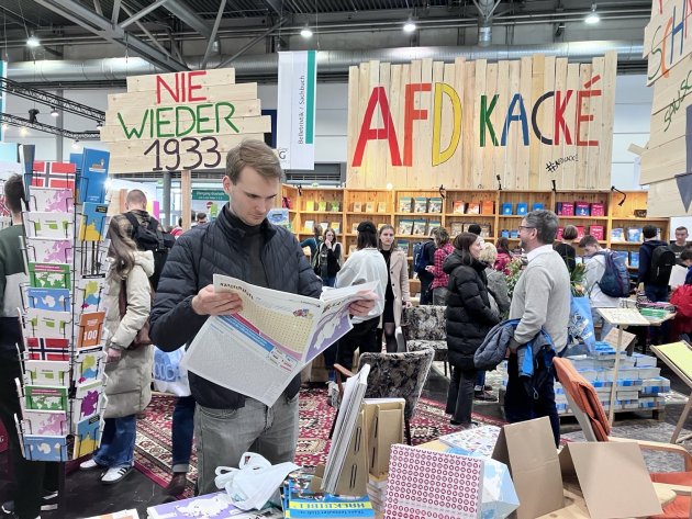 In unmittelbarer Nachbarschaft von correctiv: Der Stand von Katapult, dekoriert mit Anti-AfD-Parolen.