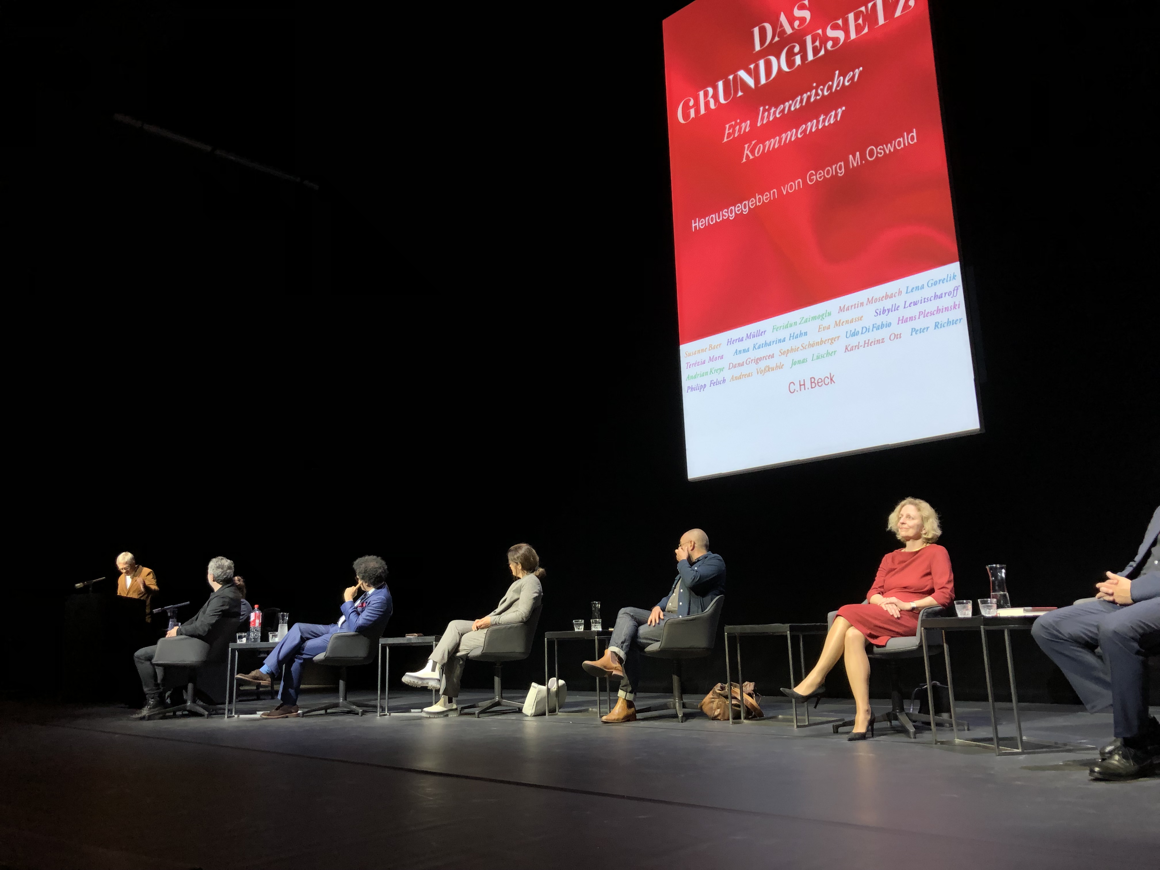 Auf der Bühne saßen, von links nach rechts, sechs Autor:innen, die Beiträge für das Buch geschrieben haben: der Schriftsteller Feridun Zaimoglu, der Literaturkritiker und Autor Ijoma Mangold, die Schriftstellerin Julia Franck, der Schweizer Schriftsteller Jonas Lüscher, die Verfassungsrechtlerin und ehemalige Vizepräsidentin des Europäischen Gerichtshofs für Menschenrechte, Angelika Nußberger, und der Rechtsanwalt und Schriftsteller Georg M. Oswald, der zugleich Herausgeber des Buchs ist.