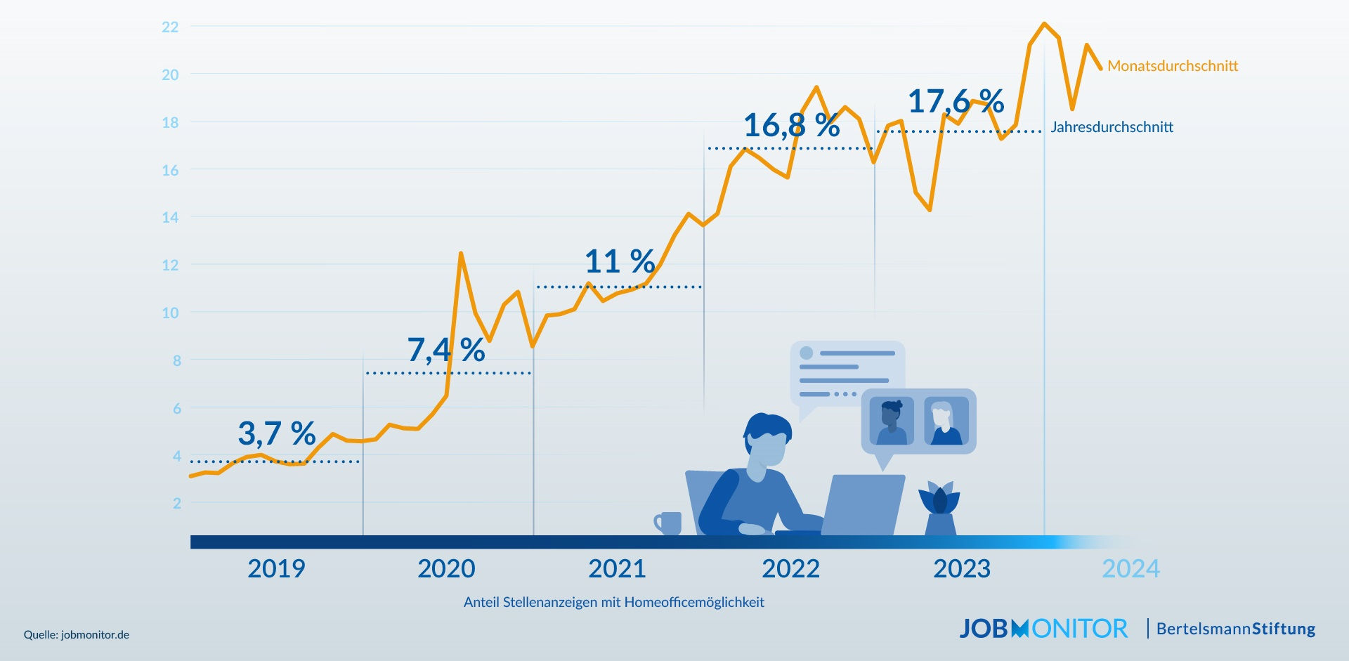 Besonders hoch war das Wachstum des Homeoffice-Angebots bei Tätigkeiten, die ein Diplom beziehungsweise einen Master erfordern. Hier stieg der Anteil von 2019 bis 2023 von 6,6% auf 31,9% aller Stellen. Bei Stellenanzeigen für Personen mit Meister oder Bachelorabschluss stieg der Anteil in diesem Zeitraum von 5,9% auf 28,0%. Bei Fachkräften mit Berufsausbildung gab es lediglich einen Anstieg von 1,7% auf 8,1%. Das Angebot steige weiterhin kontinuierlich, doch in vielen auf Präsenz angewiesenen Berufen etwa im Handwerk, im Einzelhandel oder in anderen systemrelevanten Bereichen sind die Möglichkeiten für Homeoffice-Angebote begrenzt. Bei Helfer:innen und Anlerntätigkeiten stieg das Homeoffice-Angebot zwischen 2019 und 2022 von 1,2% auf 3,7%, ging jedoch bereits 2023 wieder zurück auf 3,1%.