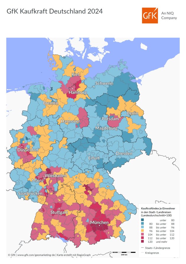 Wie in den Vorjahren weisen laut Studie mit Bayern, Baden-Württemberg, Hamburg und Hessen lediglich vier der 16 deutschen Bundesländer eine überdurchschnittliche Pro-Kopf-Kaufkraft auf – in drei Vierteln der Bundesländer sei das Ausgabepotenzial in der landesweiten Betrachtung unterdurchschnittlich. Gleichzeitig setze sich aber auch der Trend der letzten Jahre fort, dass vor allem die neuen Bundesländer die größten Kaufkraftzuwächse verzeichnen, womit sich die Kaufraftschere langsam schließe, so GfK.