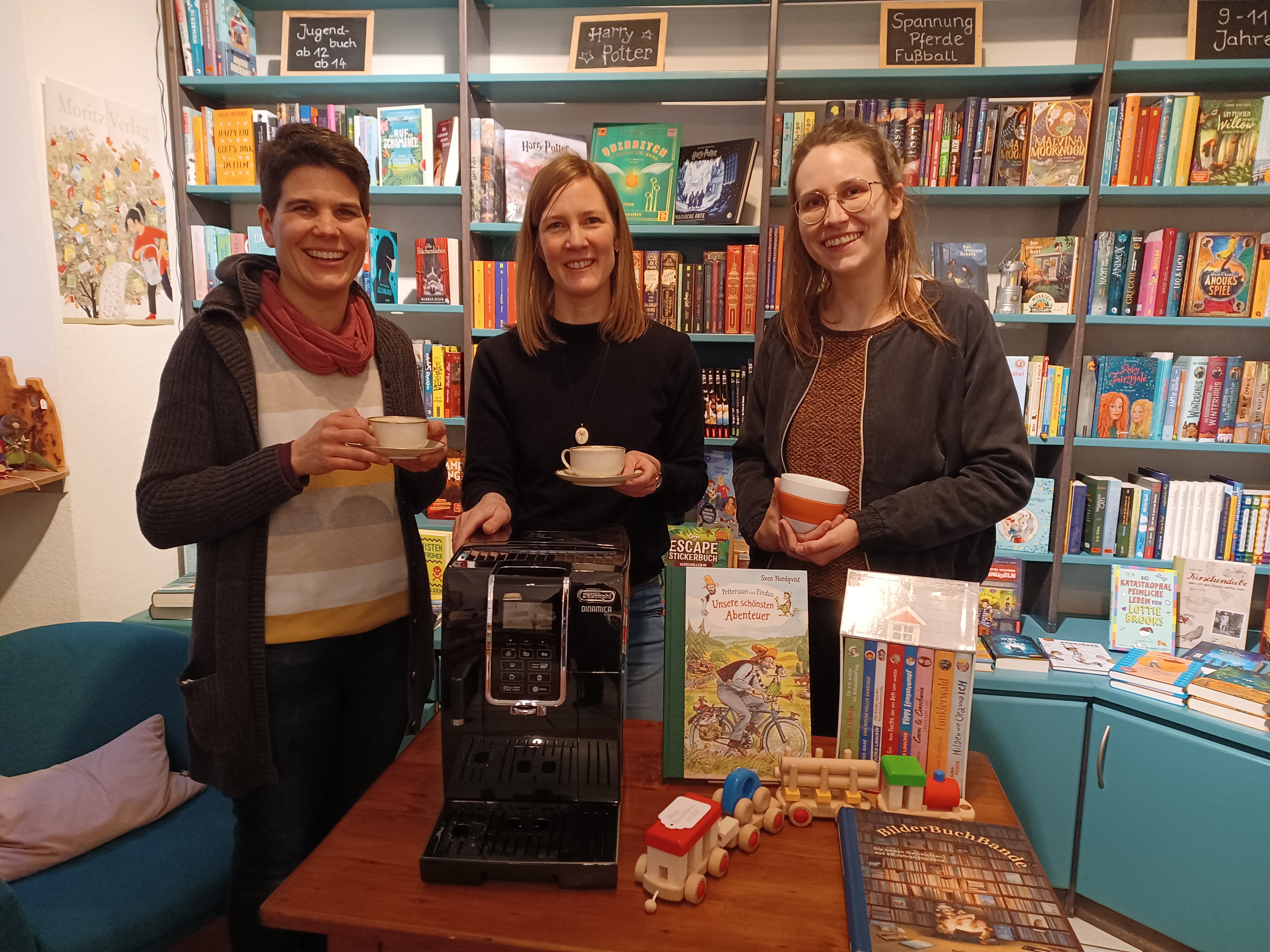 Der Hauptpreis - ein Kaffeevollautomat von De’Longhi geht nach Heidelberg. Dort freut sich das Team der Buchhandlung Murkelei über den Gewinn., der gerade eingetroffen ist. Die Buchhandlung wurde aus mehreren Hundert Teilnehmerinnen und Teilnehmern ausgelost.
