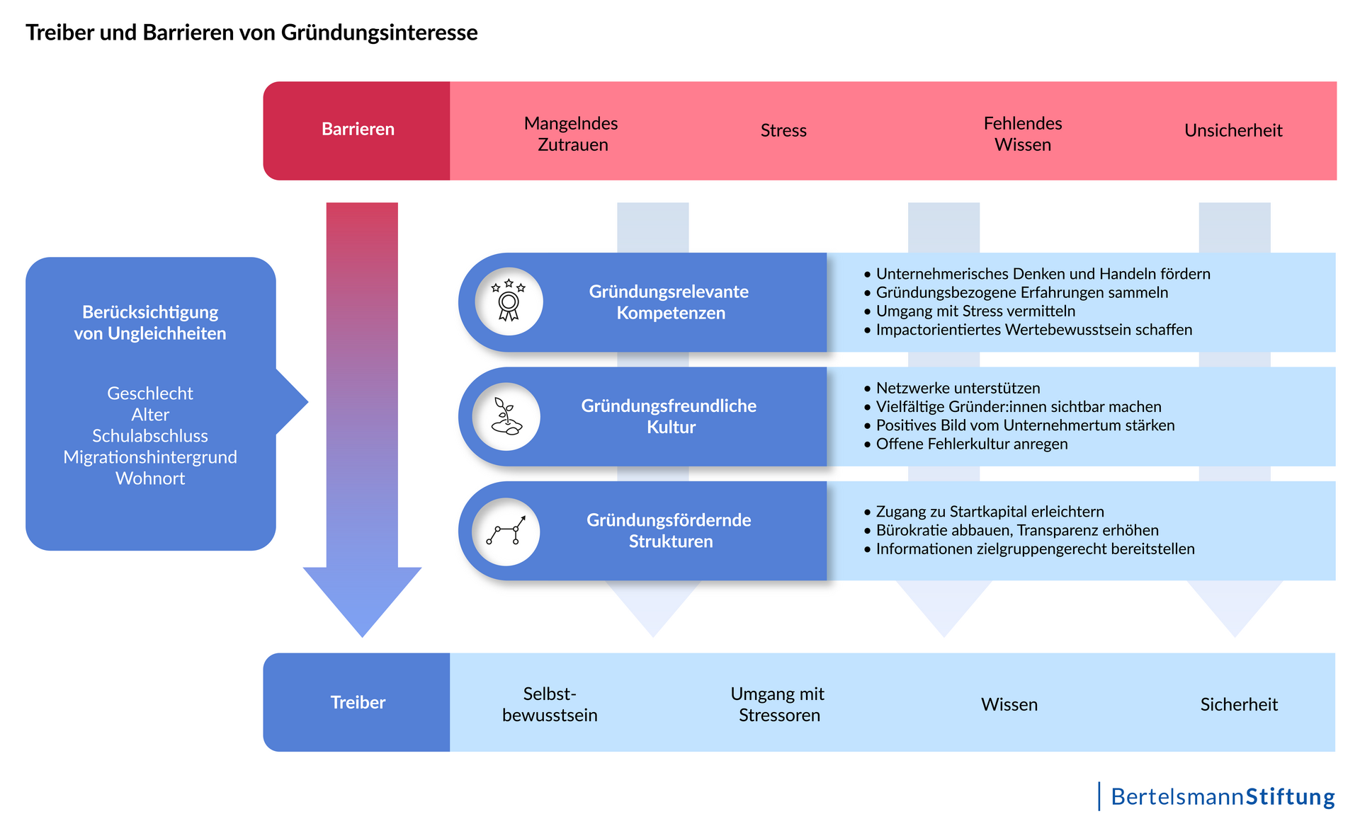 Die Bertelsmann Stiftung empfiehlt verschiedene Maßnahmen, um das Interesse an Unternehmensgründungen bei jungen Menschen zu fördern. Dazu gehören zum einen Workshops und "Schülerfirmen" sowie Angebote zum Aufbau von Resilienz während der Schulzeit.
