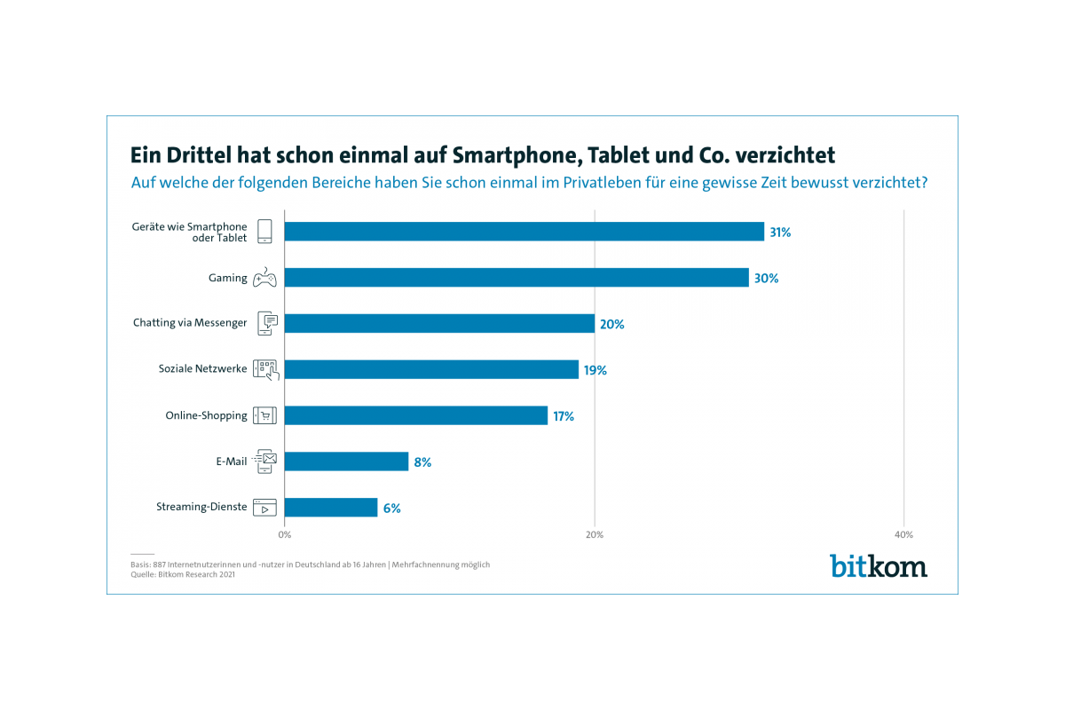 Hinweis zur Methodik: Grundlage der Angaben ist eine Umfrage, die Bitkom Research im Auftrag des Digitalverbands Bitkom durchgeführt hat. Von Anfang bis Mitte November 2021 wurden dabei 1.003 Personen in Deutschland ab 16 Jahren telefonisch befragt. Die Umfrage ist repräsentativ. Die Fragestellungen lauteten: „Haben Sie sich für das kommende Jahr 2022 vorgenommen, für eine bestimmte Zeit bewusst auf Internet und digitale Medien zu verzichten?“, „Auf welche der folgenden Bereiche haben Sie schon einmal im Privatleben für eine gewisse Zeit bewusst verzichtet?“, „Und in welchem Umfang haben Sie schon mal auf Internet und digitale Medien verzichtet?“, „Wie häufig verzichten Sie im Privatleben bewusst auf Internet bzw. digitale Medien?“ und „Wie lange haben Sie bisher maximal auf digitale Medien durchgehend verzichtet?“
