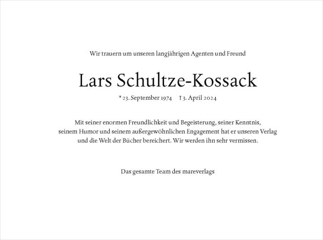 Im Alter von 49 Jahren ist der Geschäftsführer und Inhaber der Literarischen Agentur Kossack in Hamburg gestorben.