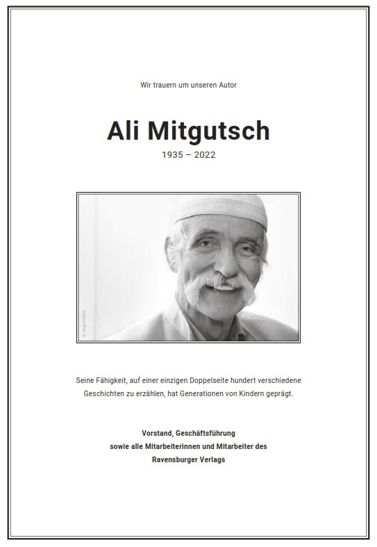 Seine Figuren waren unverwechselbar; der humorvolle und oft entlarvende Blick auf Missgeschicke, Absurditäten und das Komische in Alltag und Beziehungen sind in seine "sich selbst erzählenden Geschichtenbücher" eingeflossen, wie Mitgutsch seine Wimmelwelten bezeichnete - ihm saß der Schalk im Nacken. Am 21. August 1935 in München geboren, begann Mitgutsch seine Karriere begann er als Grafiker. Als er einige Ideen und Skizzen für Kinderbücher nach Ravensburg schickte, erkannte die junge Redakteurin Dorothee Hess-Maier (die spätere Verlegerin und Börsenvereinsvorsteherin von 1989 bis 1992) das Potenzial des neuartigen Illustrationsstils, den besonderen Witz der Darstellung und den Ideenreichtum. Was klein anfing, wurde für ihn zum Lebensthema. 1968 erschien sein erstes Wimmelbuch "Rundherum in meiner Stadt" im Ravensburger Verlag. Das Innovative fiel auch der Fachwelt auf: 1969 erhielt Ali Mitgutsch für den Titel den Deutschen Jugendbuchpreis. Mehr als 70 Bücher, Poster und Puzzles erschienen mit seinen Figuren und Zeichnungen, viele sind zu Klassikern geworden. Allein in Deutschland gingen mehr als fünf Millionen Exemplare über die Ladentische, international kamen mehr als drei Millionen verkaufte Exemplare dazu.