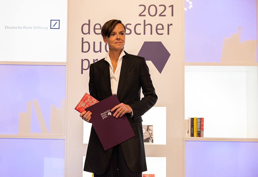 "Ich bin sehr überwältigt, sprachlos und freue mich riesig!", sagte die Autorin und dankte auch der verstorbenen Autorin Silvia Bovenschen, die sie immer wieder zum Schreiben ermutigte und der dieser Roman gewidmet sei. "Ich hätte am liebsten ein paar Worte einfach nur über Sprache gesagt, also Sprache als ästhetischer Spielplatz, als etwas, das für uns alle, die wir schreiben, so elementar ist. Für Lucia Berlin war ein Satz die Brücke über den Abgrund, für mich ist Sprache ein Ort des Berauscht- und Entrücktseins, aber auch Irritation und Wagnis. Aber sobald ich anfange, darüber nachzudenken, übertönt mich Gezerre und Gezeter, und ich lande mitten in einem furchtbaren Krieg, dem Krieg, der heute verbissen um Benennungen und Bezeichnungen geführt wird – also eben auch darüber, wer wir sein dürfen und wer das Sagen darüber hat. Und der mit einem Hass geführt wird, der total befremdlich und bedrohlich ist, andererseits aber auch schrecklich normal. Kriege wurden schon aus geringfügigeren Anlässen geführt.