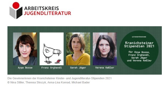 Die Jugendbuch-Stipendiatinnen sind Sarah Jäger und Verena Keßler, ausgezeichnet werden sie für ihre Debüts "Nach vorn, nach Süden" (Rowohlt rotfuchs) und "Die Gespenster von Demmin" (Hanser Berlin). Die Kinderliteratur-Stipendien gehen an Ayşe Bosse für "Pembo – Halb und halb macht doppelt glücklich!" (Carlsen) und an Franz Orghandl für "Der Katze ist es ganz egal" (Klett Kinderbuch).