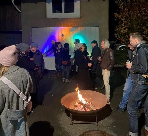 Katharina Alder, Mathias Engel, Mattias Ferroni und Giovanni Ravasio, die die Schweiz für verschiedene Verlage bereisen, hatten den Hof illuminiert und mit einer Bar ausgestattet, die Druckerei Schneider stellte den wärmeren Raum an ihrer Heidelberg Speedmaster zur Verfügung.