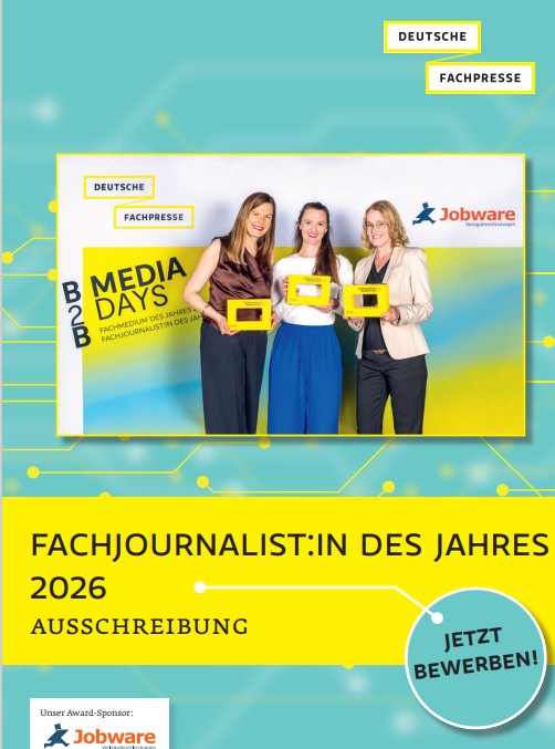Mit dem Award "Fachjournalist:in des Jahres 2026" möchte die Deutsche Fachpresse journalistische Exzellenz in der Fachkommunikation würdigen. Gesucht werden Beiträge, die durch Qualität, Originalität, Glaubwürdigkeit, Ausdrucksweise und fachliche Tiefe überzeugen – und so den professionellen Informationsaustausch in Wirtschaft, Wissenschaft und Gesellschaft stärken. Die Ausschreibung richtet sich an alle Fachjournalistinnen und Fachjournalisten mit Print- oder Onlinebeiträgen, die im Jahr 2025 in einem Fachmedium in deutscher Sprache veröffentlicht wurden (Deutschland, Österreich, Schweiz). Einsendeschluss ist der 30. Januar 2026.