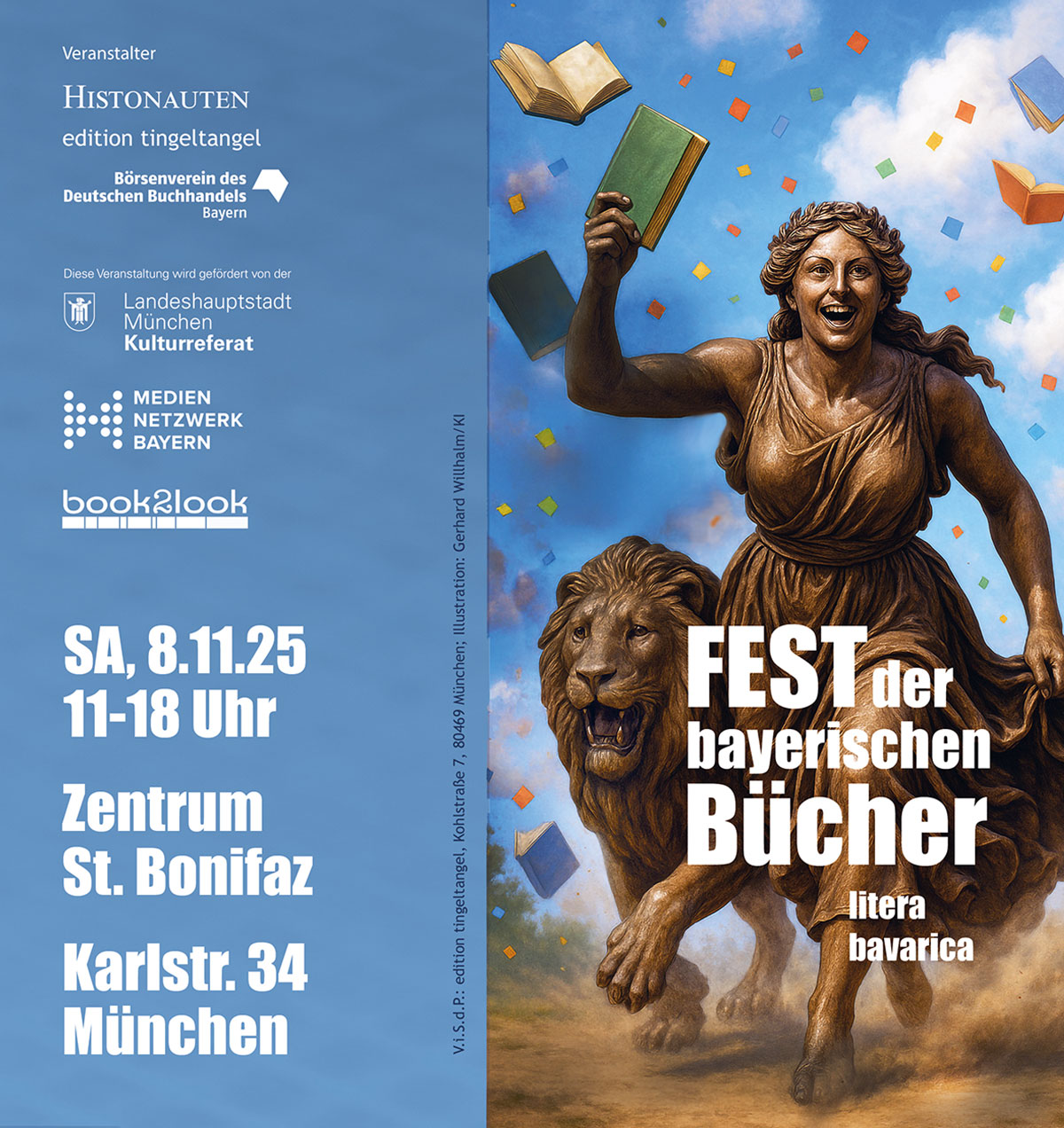 "Fest der bayerischen Bücher – litera bavarica" kann am Samstag, den 8. November von 11 bis 18 in München besucht werden – im Zentrum St. Bonifaz (Karlstraße 34), so die Ankündigung. Veranstalter sind der Landesverband Bayern im Börsenverein, die Histonauten, die sich der Münchner Stadtgeschichte, der Bayerischen Landesgeschichte, der Deutschen Zeitgeschichte und der Europäischen Kulturgeschichte widmen, und die Edition Tingeltangel. "Gefördert vom MedienNetzwerk Bayern, dem Kulturreferat der Landeshauptstadt München und Book2look, rücken wir unter dem Motto 'weiß-blau und weltoffen' all jene Publikationen ins Licht, die Land und Leute in all ihrer Vielfalt darstellen", kündigt Thomas Endl, Verleger der Edition Tingeltangel, in einer Mitteilung an.
