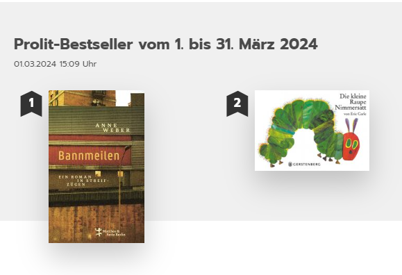 Aus der Vormonats-Liste bleibt lediglich "Die kleine Raupe Nimmersatt" (Gerstenberg) drin und landet auf einem Spitzenrang, auf Platz 2. Sicher auch ein gefragtes Osterpräsent.