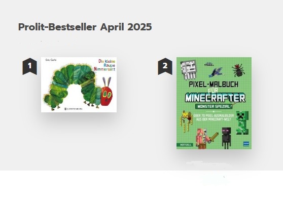Auf mögliche Ostergeschenke für Kinder deuten etliche Titel in der Top 10-Prolit-Liste für den April (Zeitraum: 1.–28. April) hin: Von Rang 4 im Vormonat auf Platz 1 klettert "Die kleine Raupe Nimmersatt" in der Pappausgabe (Gerstenberg; ET: Juni 2025) von Eric Carle. Von Daniele Sapuppo (Illustration) finden sich zwei Titel in der Liste: "Pixel-Malbuch für Minecrafter – Monster Spezial" (Ullmann Medien; ET: Februar 2024) neu auf Platz 2, und das in diesem Jahr erschienene "Pixel-Malbuch für Minecrafter – Biome Spezial" (Ullmann Medien; ET: 5. März) auf Position 7. Ebenfalls als Präsente zu Ostern könnten Rotraut Susanne Berners "Frühlings-Wimmelbuch" (Gerstenberg; ET: 3. Auflage, Januar 2024 – Platz 6) und "Sommer-Wimmelbuch" (Gerstenberg; ET: 3. Auflage, August 2024 – Platz 8) gedient haben.