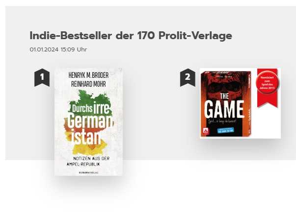 Basis der monatlichen Bestseller-Liste sind die Verkäufe der 170 Prolit-Verlage, mit Büchern (alle Warengruppen; HC, PB, TB) und Non-Books. Im Januar (1.–27. Januar) steht "Durchs irre Germanistan" (Europa Verlage; ET: 25. August 2023). Die Autoren Henryk M. Broder und Reinhard Mohr "resümieren mit viel Humor und Liebe zum Detail, was in diesem merkwürdigen Land vorgeht und viele ratlos oder wütend zurücklässt", schreibt der Verlag zum Inhalt. Mit dabei sind auch vier Spiele, auf Platz 2 kommt "The Game – Das Original" des Nürnberger Spielkarten Verlags. Im Mittelfeld tummeln sich die Bilderbuchklassiker "Die kleine Raupe Nimmersatt" (Gerstenberg; Platz 4) von Eric Carle und das "Frühlings-Wimmelbuch" (Gerstenberg; Platz 5) von Rotraut Susanne Berner. Der neunte Platz geht an Adania Shiblis "Eine Nebensache" (Berenberg).