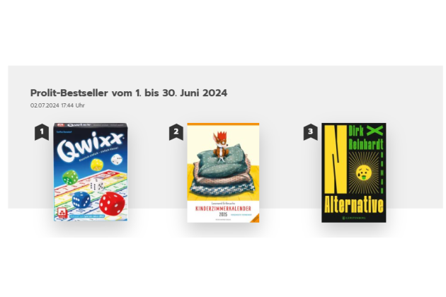 Das Würfel-Spiel "Qwixx – Das Original", herausgegeben vom Nürnberger Spielkarten Verlag, und jetzt im Königsfurt-Urania Verlag, war 2013 als Spiel des Jahres nominiert. In der Jurybegründung hieß es damals: "Mit minimalem Materialeinsatz bietet Qwixx maximalen Würfelspaß. Das quicke Spiel in der kleinen Schachtel und mit schnell verstandener Regel begeistert alle Generationen gleichermaßen. Da jeder von jedem Wurf profitieren kann, fiebern immer alle Spieler dem nächsten Würfelergebnis entgegen. Risiko eingehen oder vorsichtig agieren? Die kurzweilige Mischung aus Glück und Taktik hat das Potenzial, ein Dauerbrenner zu werden – zumal es in jedes Reisegepäck passt." Ein Dauerbrenner ist es geworden und zum Beginn der Urlaubssaison steht es passend an der Spitze der Prolit-Liste im Juli.