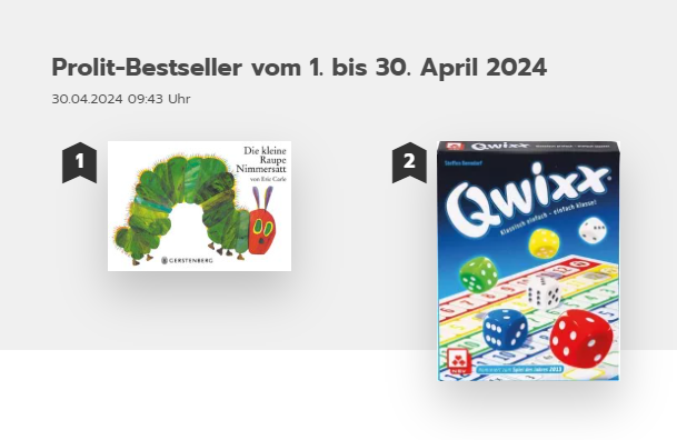 "Die kleine Raupe Nimmersatt" (Gerstenberg, Pappausgabe, August 1994, aktuell in 53. Auflage; Ü: Viktor Christen), der Bilderbuchklassiker von Eric Carle, klettert von Platz 2 im Vormonat nun an die Spitze der Top 10 der Verlagsauslieferung Prolit. Auf Platz 10 ist das Klippklapp-Buch "Die kleine Raupe Nimmersatt – Auf dem Bauernhof" (Gerstenberg, Januar 2024; Ü: Ulli und Herbert Günther) neu dabei.