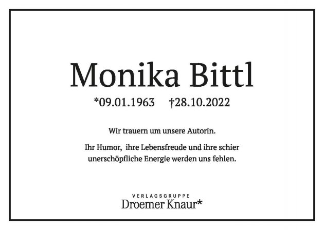 Mit großer Trauer und Bestürzung habe man bei Droemer Knaur vom Tod der Autorin Monika Bittl erfahren.