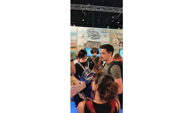 Zu diesen Spielen gehört auch das Simulationsspiel "Tiny Bookshop". Darin führt man seine eigene Buchhandlung in idyllischer Umgebung. Vor Ort veranstalteten die Produzenten ein Suchspiel, bei dem verschiedene "Bücher" in Form der im Spiel verwendeten Icons auf kleinen Tafeln an umliegenden Ständen versteckt waren. Wer drei davon gefunden und fotografiert hatte, durfte sich einen kleinen Preis abholen.