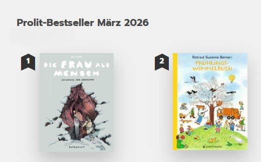 Für Ulli Lust ändert sich die Reihenfolge ihrer beiden bisherigen "Die Frau als Mensch"-Bände, ihrer "groß angelegten Erforschung der Rolle der Frau in der menschlichen Kunst- und Kulturgeschichte", in der März-Liste der meistverkauften Titel der Prolit Verlagsauslieferung. Von Platz 5 im Vormonat auf die Eins klettert der erste Teil "Die Frau als Mensch: Am Anfang der Geschichte" (Reprodukt; ET: Februar 2025), für den Lust 2025 den Deutschen Sachbuchpreis erhalten hatte. Die in der Eiszeit angesiedelte Fortsetzung "Die Frau als Mensch 2: Schamaninnen" (Reprodukt), die am 23. Februar 2026 erschienen ist, startete im Februar auf dem ersten Platz – einen Monat später rangiert sie auf dem dritten Platz. Mit den zweiten Teil war Ulli Lust für den Preis der Leipziger Buchmesse 2026 in der Kategorie Sachbuch nominiert. Lust kommentiere "nachdenklich und manchmal keck von heute aus mit, was Schamaninnen zu einem so lebhaften wie seine Quellen und spekulativen Seiten offenlegenden Comic-Essay macht", meinte die Jury.