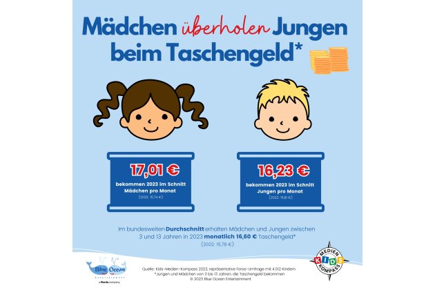Laut "Kids-Medien-Kompass 2023" erhalten Mädchen erstmals mehr Taschengeld als Jungen, berichtet Blue Ocean Entertainment über die repräsentative Forsa-Umfrage. Mädchen zwischen drei und 13 Jahren, die Taschengeld bekommen, erhalten in diesem Jahr durchschnittlich 17,01 Euro im Monat, während die gleichaltrigen Jungen nur 16,23 Euro bekommen. Nachdem Mädchen beim Taschengeld im vergangenen Jahr zu den Jungs aufgeschlossen hatten (2022: Mädchen: 15,74 Euro; Jungen: 15,81 Euro), lassen sie die Altersgenossen nun deutlich hinter sich.