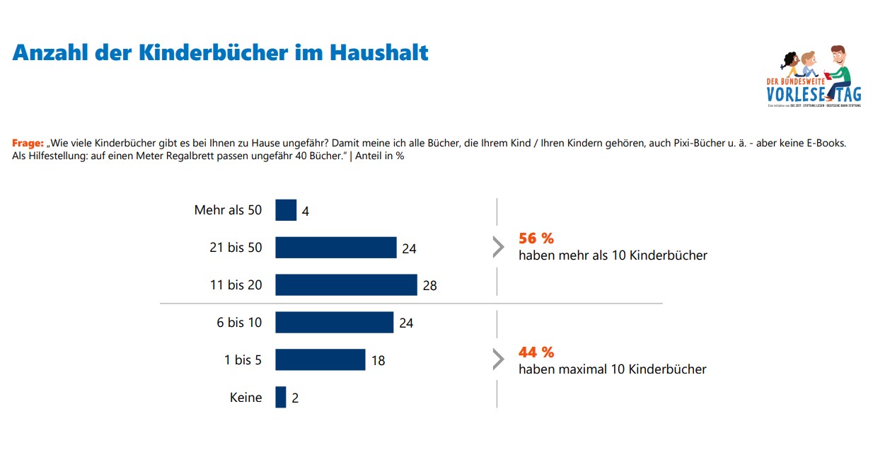 Die jährliche Vorlesestudie von "Zeit", Stiftung Lesen und Deutsche Bahn Stiftung ist in diesem Jahr mit neuem Studiendesign als "Vorlesemonitor" erschienen, zu dem mehr als 800 Eltern zu ihrem Vorleseverhalten befragt wurden. Als einen Grund dafür, dass 39 Prozent der 1- bis 8-jährigen Kinder selten oder nie vorgelesen wird, sieht die Studie die Verfügbarkeit von Vorlesestoff: "Denn je mehr Kinderbücher im Haushalt vorhanden sind, desto regelmäßiger lesen Eltern ihren Kindern vor und geben frühe Impulse fürs (Vor-)Lesen weiter." Die Studienergebnisse zeigten deutlich, dass die bisherigen Fördermaßnahmen nicht ausreichten, meint Rainer Esser, Geschäftsführer der Zeit-Verlagsgruppe. "Nur eine verbesserte Verfügbarkeit von Büchern und digitalen Vorlesematerialien kann dazu beitragen, dass Vorlesen und Lesen in mehr Familien stattfindet."