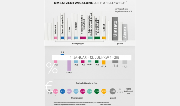 Der Buchhandel wird nicht müde, sein aus dem Corona-Lockdown resultierendes Umsatzminus weiter zu verkleinern. Lesen Sie hier, wie sich Umsätze, Absatzmengen, Preise und Warengruppen von der Kalenderwoche 1 bis zur Kalenderwoche 28 entwickelt haben.
