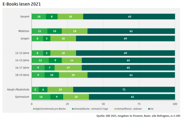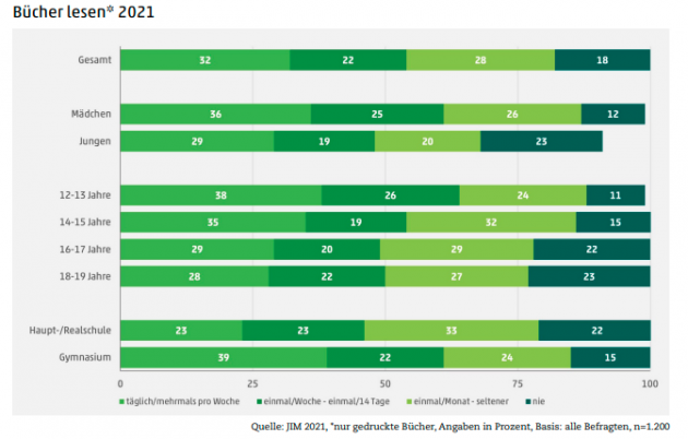 Nur noch 32% der Jugendlichen nehmen regelmäßig ein Buch in gedruckter Form in die Hand. Damit sinkt der Anteil der ein Buch lesenden Mädchen (36%) und Jungen (29%) das dritte Jahr in Folge und ist so niedrig wie noch nie in den letzten 10 Jahren. 2020 lag die Zahl der Jugendlichen, die täglich oder mehrmals pro Woche zum Buch griffen, noch bei 35% der Jugendlichen. Zu diesem Ergebnis kommt die aktuelle JIM-Studie 2021, die am 30. November 2021 vom Medienpädagogischen Forschungsverbund Südwest veröffentlicht wurde und in diesem Jahr zum zweiten Mal die Mediennutzung von Jugendlichen während der Corona-Pandemie bewertet.