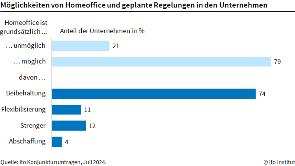 Nur 12% möchten strengere Regelungen einführen. Lediglich 4% der Unternehmen, in denen es möglich ist, möchten ihre Homeoffice-Regelungen komplett abschaffen.