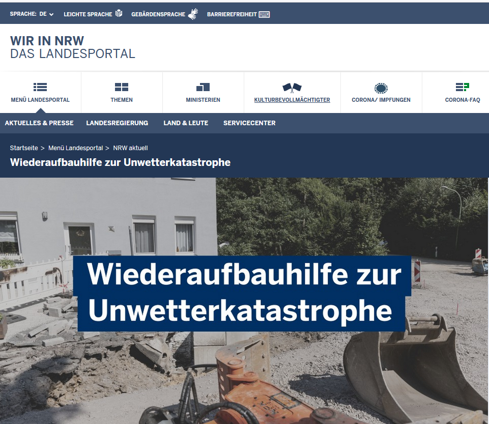 Nach Angaben der NRW-Landesregierung stehen für den Wiederaufbau in Nordrhein-Westfalen Mittel in Höhe von rund 12,3 Milliarden Euro aus dem Aufbaufonds 2021 bereit. Die dazugehörende Förderrichtlinie "Wiederaufbau Nordrhein-Westfalen" wurde am 13. September veröffentlicht.