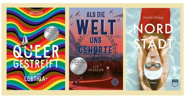 "Warum länger hinauszögern", meinte Ministerin Lisa Paus, "ich öffne jetzt einfach den Umschlag ..." und nannte als Gewinnerin in der Sparte Sachbuch "Queergestreift. Alles über LGBTIQA+" (Hanser) von Kathrin Köller und Irmela Schautz. "Ein Augenöffner, den wir uns alle wünschen", so Juryvorsitzende Iris Kruse. "Warum braucht es das Buch?", fragte Paus. "Es ist höchste Zeit, dass sich auch die Mehrheitsgesellschaft damit auseinandersetzt", meinte Köller. "Es ist gar nicht so einfach, Klischees illustratorisch aufzubrechen", erklärte Illustratorin Irmela Schautz. "Ihr müsst nicht alles verstehen, nicht von allem Ahnung haben, aber ein gewisses Maß an Respekt ist notwendig", so Köller an die Jugendlichen im Saal.