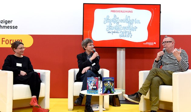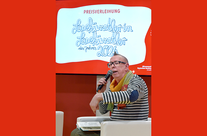 Denn Jochen Till hat früher immer Linus König als Sprecher dabeigehabt, weil er unter Druck stottert: "Freies Sprechen war nie ein Problem, da konnte ich eben ein anderes Wort benutzen als das, was nicht rauswollte - aber der Text ist nun mal, wie er ist, auch wenn ich ihn selbst geschrieben habe" , erzählte den Zuhörer:innen im "Bunten Forum" in Halle 3 der Leipziger Messe. Nach vielen Jahren hatte er aber einen Lesungstermin ausgemacht und Linus König konnte nicht. "Da musste ich ins kalte Wasser springen. Aber ich hatte mir inzwischen schon so viel von ihm abgeguckt, dass ich wusste, wie er betont, wo er Pausen macht, na, und es hat dann auch bei mir geklappt." Linus König liest allerdings weiterhin Tills Hörbücher ein. "Dass ich nun diesen Preis bekomme, das ist etwas ganz Besonderes", meinte Till. Auf facebook schrieb er kurz danach: "Mein absolutes Highlight (nicht nur auf der Messe, sondern in meiner gesamten Karriere) war die Preisverleihung zum LESEKÜNSTLER DES JAHRES 2024!" Als Franziska Neuhaus (Moritz Verlag und Mitglied der IG Leseförderung des Börsenvereins) die Begründung der Jury vorgelesen habe, "habe ich tatsächlich feuchte Augen bekommen".