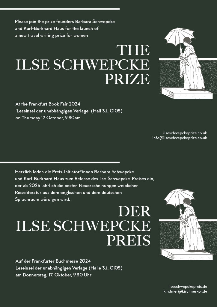 Die besten Neuerscheinungen weiblicher Reiseliteratur wollen die Initiator:innen Barbara Schwepcke (Haus Publishing / Gingko) und Karl-Burkhard Haus (Schriftform Redaktionsbüro) mit dem neuen Ilse-Schwepcke-Preis würdigen. Der mit 6000 €, beziehungsweise 5.000 £ dotierte Preis wird künftig jährlich an jeweils eine auf Deutsch schreibende und eine auf Englisch schreibende Reiseschriftstellerin vergeben.