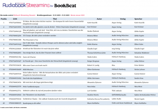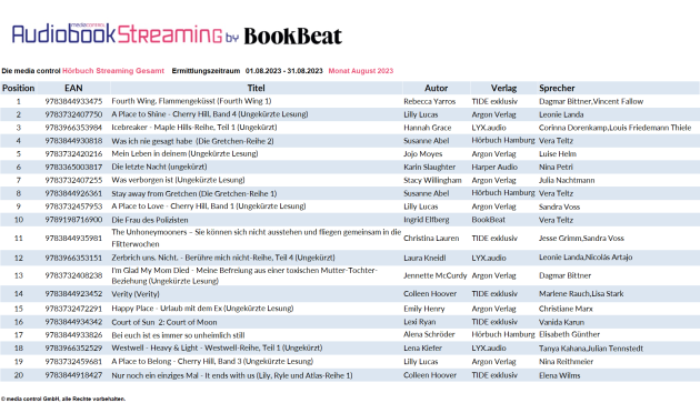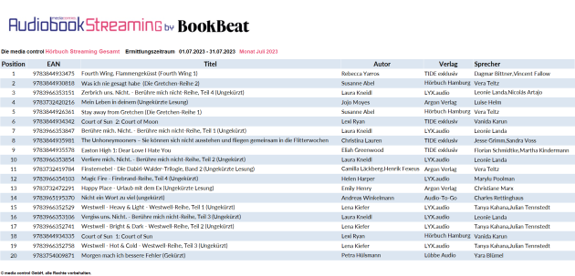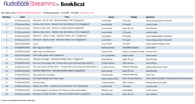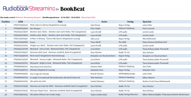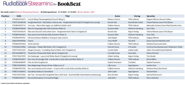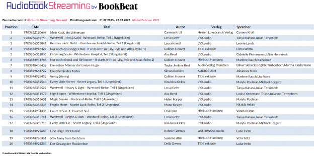 Die Liste basiert anders als herkömmliche Bestsellerlisten auf den tatsächlich gehörten Stunden. Die Top 20 wird zusammen vom Hörbuch-Streaming-Anbieter BookBeat und Media Control jeden Monat neu herausgegeben und auf Börsenblatt online veröffentlicht.