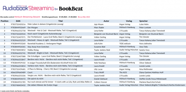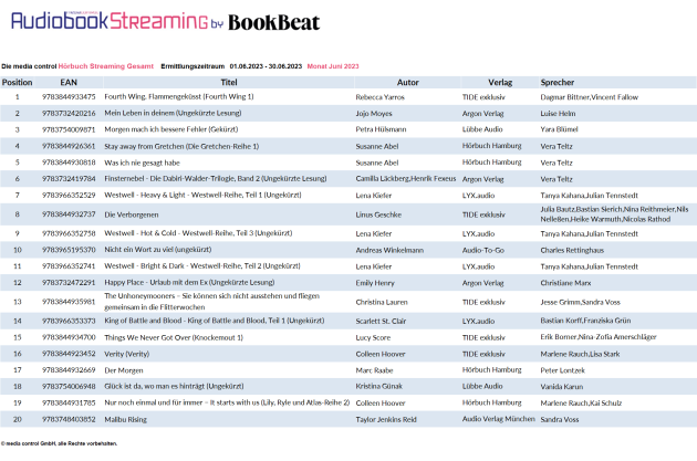 In den Top 20, die alle Warengruppen berücksichtigt, stehen zudem vier Titel von Colleen Hoover. Bestplatziertes Sach-Hörbuch ist "Pick me Girls" (Tacheles!) von Sophie Passmann, eingelesen von ihr selbst.