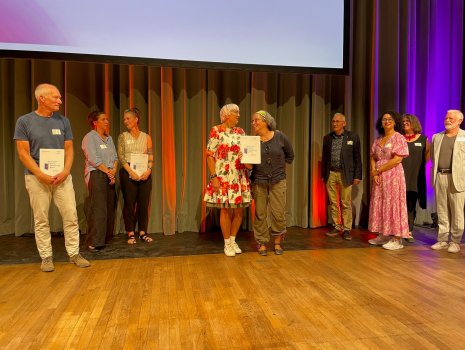 Vertreter:innen der "besten Buchhandlungen" auf der Bühne mit Kulturstaatsministerin Claudia Roth