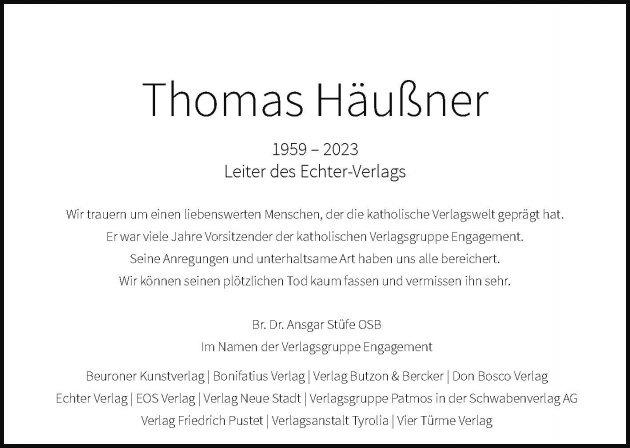 Thomas Häußner, der langjährige Geschäftsführer des Würzburger Echter Verlags, ist am 27. Februar im Alter von 63 Jahren gestorben.