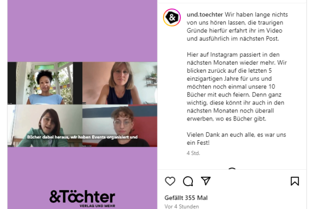 "4 Frauen, 10 Bücher, 53 Autor*innen, 15 Book-Release-Partys, 5 Literaturmessen, 3 Literaturpreise und 2 Nominierungen, 1 Verlagspreis und unzählige Literaturevents, Panel-Talks und Kooperationen. Wir sind dankbar für eine unfassbar schöne Zeit, die wir allen zu verdanken haben, mit denen wir zusammenarbeiten durften und die uns in den guten und den schwierigen Zeiten mit Rat und Tat zur Seite standen. Die von Stunde eins an uns geglaubt, die ihr Insiderwissen mit uns geteilt und ihre Zeit dafür gegeben haben, dass wir einen Fuß in die Tür bekommen (der Buchhandel hat die härteste Tür Deutschlands, glaubt uns)", schreiben die Verlegerinnen des &Töchter-Verlages Laura Nerbl, Elena Straßl, Jessica Taso und Sarah Zechel am 11. Juli in ihrem Statement auf Instagram. Sie verabschieden sich mit diesem Post und einem Reel auf ihrer Instagramseite und begründen ihre Entscheidung der Verlagsauflösung.