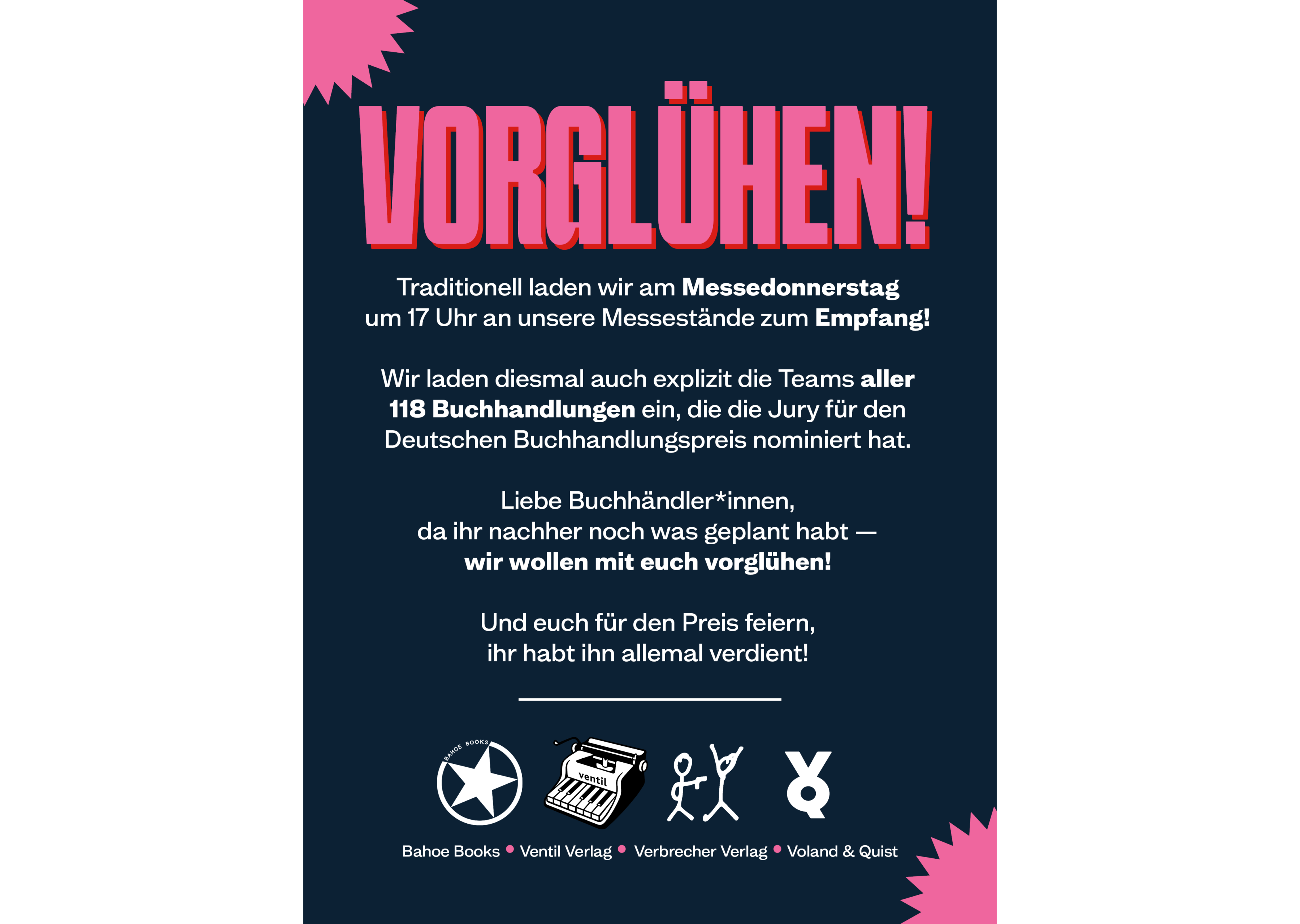 "Vorglühen! Traditionell laden wir am Messedonnerstag um 17 Uhr an unsere Messestände zum Empfang. Wir laden diesmal auch explizit die Teams aller 118 Buchhandlungen ein, die die Jury für den Deutschen Buchhandlungspreis nominiert hat. Da ihr nachher noch was geplant habt – wir wollen mit Euch vorglühen! Und euch für den Preis feiern, ihr habt ihn allemal verdient!" (Halle 5, G 204 bis G 207)