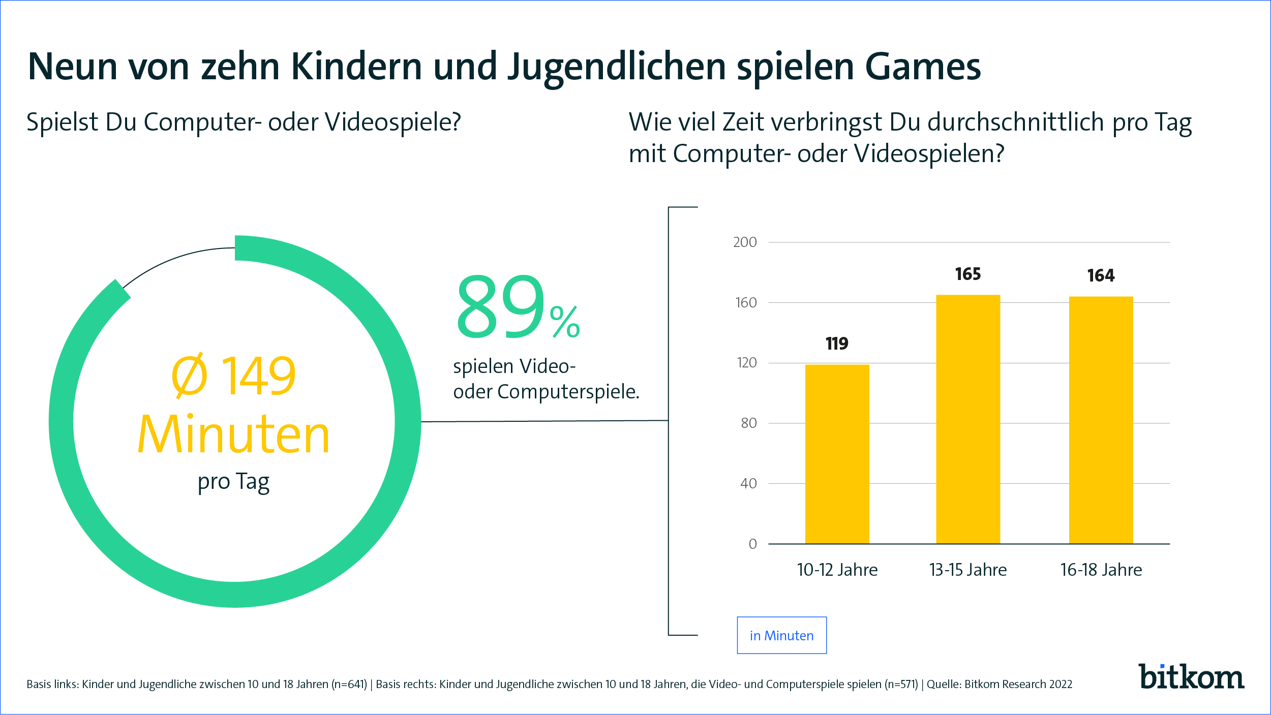 Kinder und Jugendliche in Deutschland verbringen im Durchschnitt zwei Stunden und 29 Minuten pro Tag mit Computer- oder Videospielen – am Wochenende liegt der Wert noch einmal deutlich höher. Das ist das Ergebnis einer Umfrage des Branchenverbands Bitkom.
