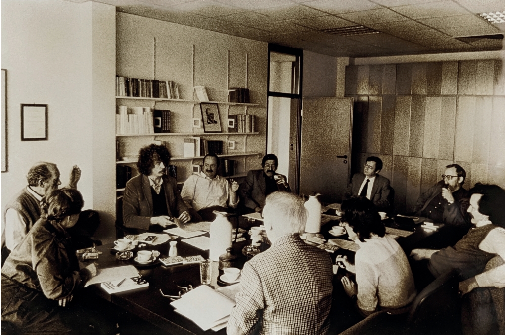 Redaktionssitzung 1980: Carola Stern, Heinrich Böll, Johano Strasser, Heinz Ludwig Arnold, Günter Grass, Berndt Oesterhelt, Heinrich Vormweg und Erdmann Linde, Dieter Vollendorf und Tomás Kosta (v. l. n. r.)