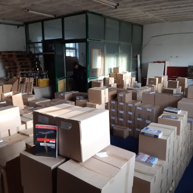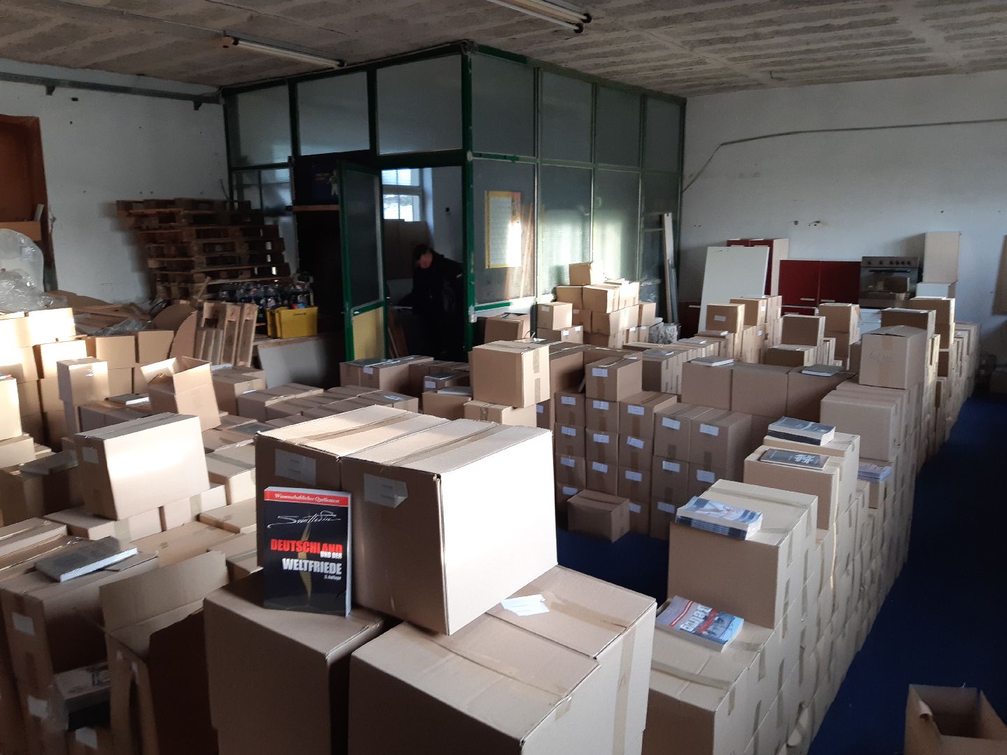 In einer Lagerhalle wurden rund 80 Paletten mehrerer Tausend strafrechtlich relevanter oder indizierter Publikationen wie Bücher und elektronische Speichermedien sichergestellt worden, darunter zahlreiche unkommentierte Nachdrucke von Hitlers „Mein Kampf“.