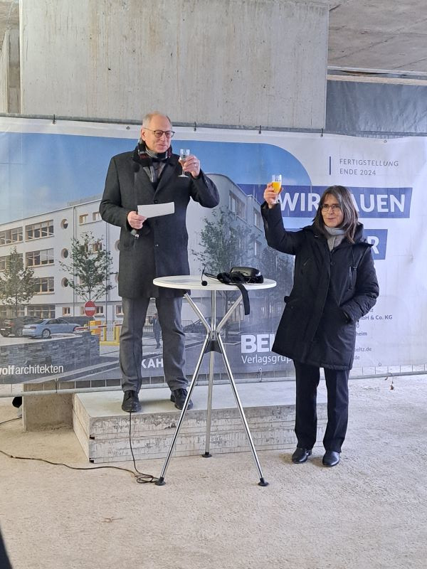 Der Richtspruch von Bauleiter Andreas Scheuermann sorgte für sichtliche Heiterkeit. Nachdem Matthias Rübelmann als Vertreter des Bauherrn den Gästen einige technische Details zum Neubau erläuterte und die gute Zusammenarbeit mit allen Beteiligten betonte, unterstrich Beltz-Geschäftsführerin Marianne Rübelmann in ihrer Rede das Bekenntnis des Verlags zu Weinheim, für das der Neubau ein starkes Symbol geworden sei. Oberbürgermeister Manuel Just betonte, wie wichtig die Kooperation zwischen Stadt und der Verlagsgruppe Beltz als lokalem Unternehmen sei und würdigte die Investitionsbereitschaft der Familie Rübelmann in den Standort. Im Anschluss lud die Verlagsgruppe zu Speisen und Getränken auf der Baustelle ein.