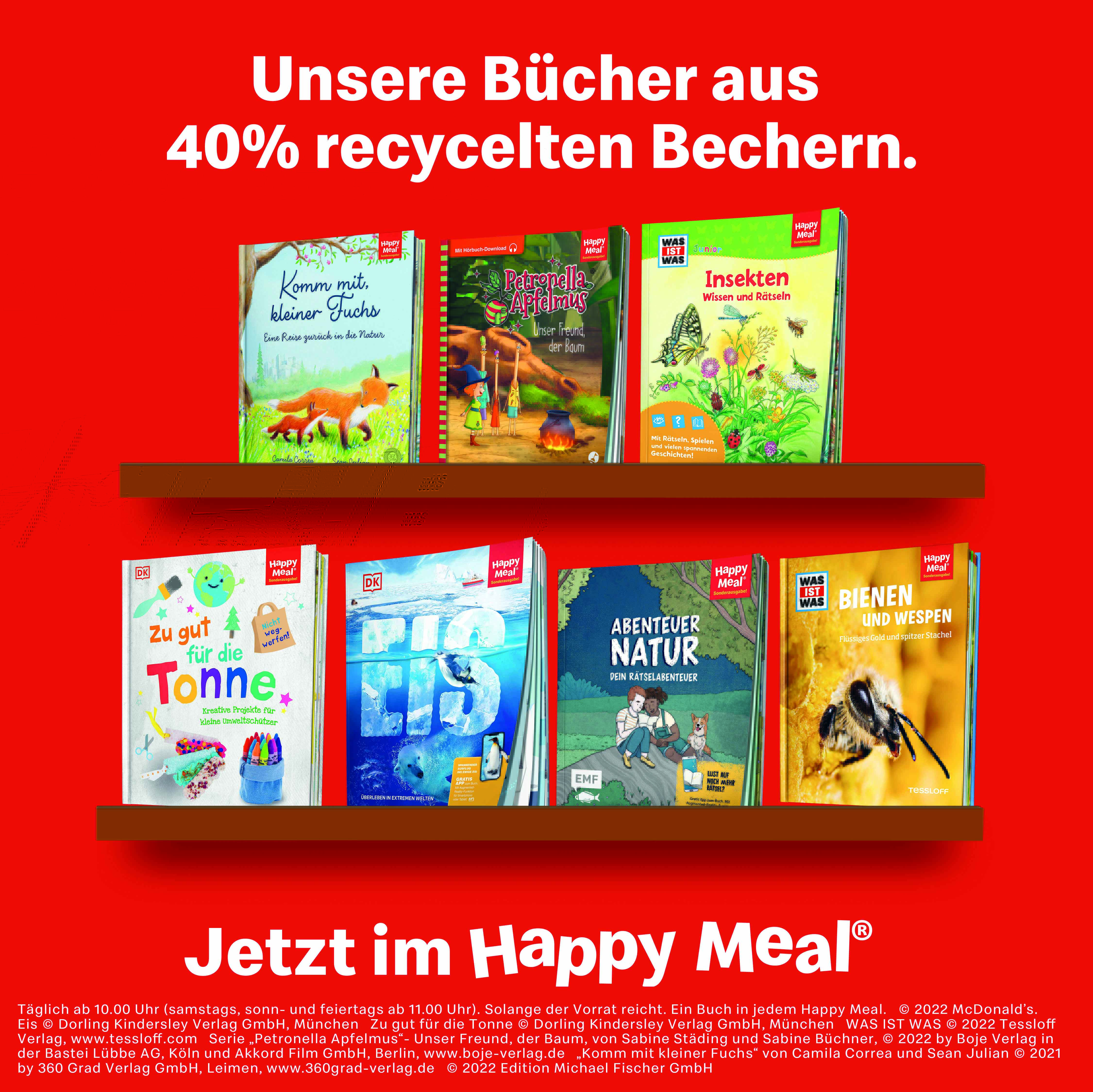Bei den papierbasierten McDonald’s Verpackungen setzt das Unternehmen nach eigenen Angaben schon zu 100 Prozent auf Verpackungen und Tüten, die aus recycelten oder zertifizierten Quellen stammen. Außerdem wurde gemeinsam mit Lieferant:innen ein eigenes Recyclingsystem entwickelt, um Papierbecher von Getränken und Softeis zu bedruckbaren Papierbögen aufzubereiten. Und diese spielen jetzt auch bei der Leseförderung des Unternehmens die Hauptrolle: Sie werden jetzt auch für die aktuellen Happy Meal Bücher genutzt. Die Bücher bestehen zu 40 Prozent aus recyceltem Bechermaterial und zu 60 Prozent aus Frischfaserpapier aus zertifizierter Forstwirtschaft. „Hierbei handelt es sich um ein in der Bücherwelt einmaliges Verfahren, das zeigt, wie Wertstoffkreisläufe geschlossen werden können und benutztes Material ein hochwertiges zweites Leben erhält. Dieser innovative Ansatz ist nicht nur wirtschaftlich, sondern auch nachhaltig“, sagt Markus Weiß, Unternehmenssprecher von McDonald’s Deutschland.