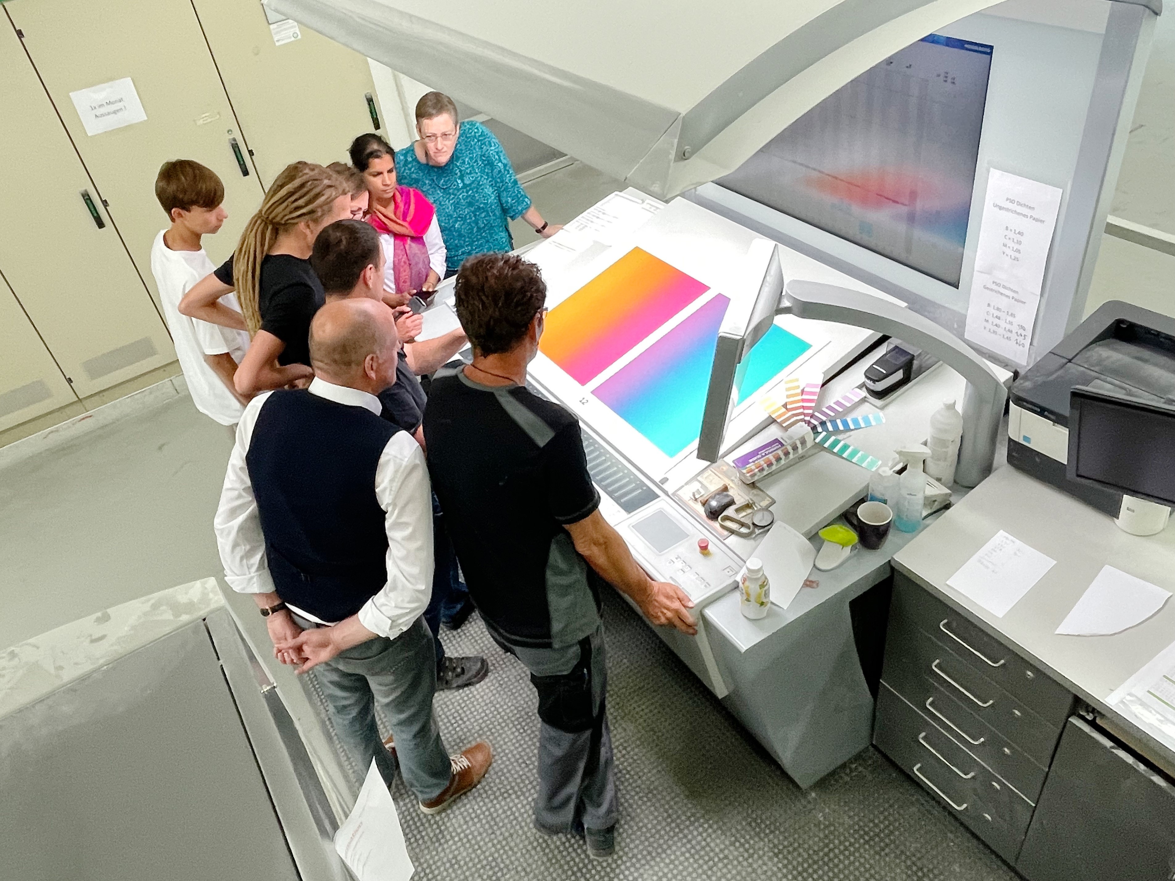 Art Director Stephan Schlieker erinnerte sich dann an ein besonderes Druckverfahren, dessen Ergebnisse man nur bedingt beeinflussen kann: den historischen Irisdruck. Dabei werden die Farben Stoß an Stoß auf die Farbwalzen manuell aufgetragen, sodass die ineinanderlaufenden Farbränder in einem Druckvorgang gedruckt werden. Allerdings: Heute druckt niemand mehr so. Der Verlag fragte aber einfach bei der Druckerei Staudigl in Donauwörth an, die Lust auf das ungewöhnliche Experiment hatte und mit der Heidelberger Druckmaschinen AG nach technischen Umsetzungsmöglichkeiten suchte.