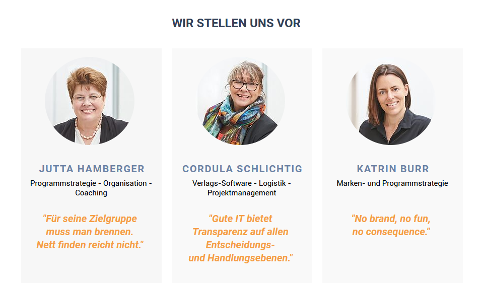 Themenfelder für die Beratung sind unter anderem Programmstrategie, Organisation, Verlags-Software, Produktmanagement und Marken- und Programmstrategie.