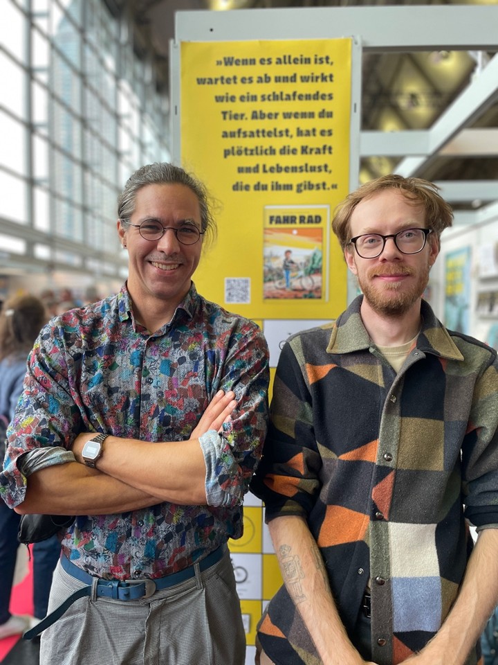 Hans-Gerd Koch, Verleger des Karl Rauch Verlags, hatte die tolle Idee, den tschechischen Titel des Familien-Sachbuchs „Fahrrad“ in einen Imperativ zu übersetzen: „Fahr Rad“. Die erste Auflage war nach einem Monat verkauft, es gab tolle Besprechungen und die Nominierung für den Deutschen Jugendliteraturpreis. Den gab es nun zwar nicht – aber Verlag, Autor und Illustrator sind dennoch allerbester Laune. Wobei man Jindřich Janíček besser als Co-Autor ansprechen sollte, der visuell arbeitet: Von Ondřej um Mitwirkung gebeten, meinte er, dass ihm das Thema gefalle – er aber leider keine Fahrräder zeichnen könne. Die Lösung: „Ich habe Jindřich eine große Kiste mitgebracht, in der ein komplett zerlegtes Rad war. Er hat es mit meiner Hilfe zusammengebaut. Er hat das Thema also nicht intellektuell, sondern mit den Händen aufgenommen. Und am Ende mehr als 300 Räder im Buch gezeichnet.“