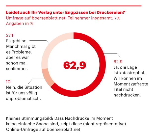Für Hanser waren die Engpässe in den vergangenen Wochen besonders schwerwiegend, weil der Verlag allein mit vier Titeln auf der Longlist für den Deutschen Buchpreis vertreten war und die Nachfrage entsprechend in die Höhe schnellte. Dass das Thema aber viele in der Branche umtreibt, zeigt eine Umfrage auf boersenblatt.net: Fast 63 Prozent der Teilnehmer:innen (44 von 69) bestätigen: "Ja, die Lage ist katastrophal. Wir können gefragte Titel im Moment nicht nachdrucken".