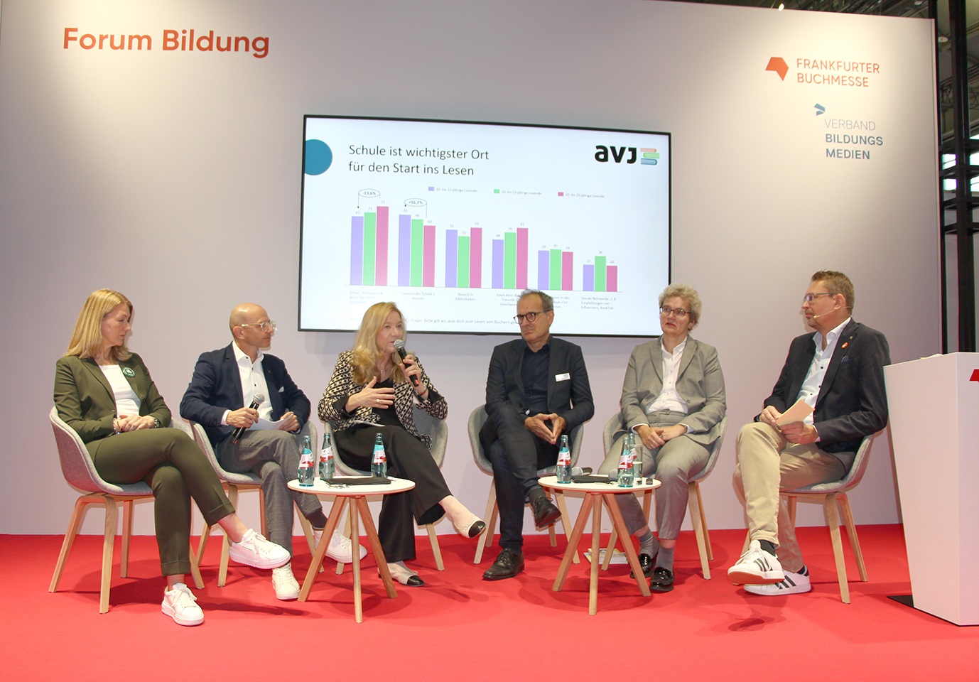 Veranstalter der Podiumsdiskussion unter dem Titel "Lesekompetenz im Sinkflug – Gefahr für den Wirtschaftsstandort Deutschland?" war die Arbeitsgemeinschaft von Jugendbuchverlagen (avj). Sie hatte Barbara Ofstad (Siemens AG), Niko Georgiadis (Die Bahn AG), Frank Kühne (Carlsen Verlag / Bonnier Media Deutschland), Dr. Brigitte Scheuerle (IHK Frankfurt) und Eva Simmelbauer (Thalia Bücher GmbH) am vergangenen Freitag im Rahmen der Frankfurter Buchmesse im Forum Bildung zur Diskussion gebeten. Ebenfalls auf dem Podium saß der avj-Vorsitzende Bernd Herzog.