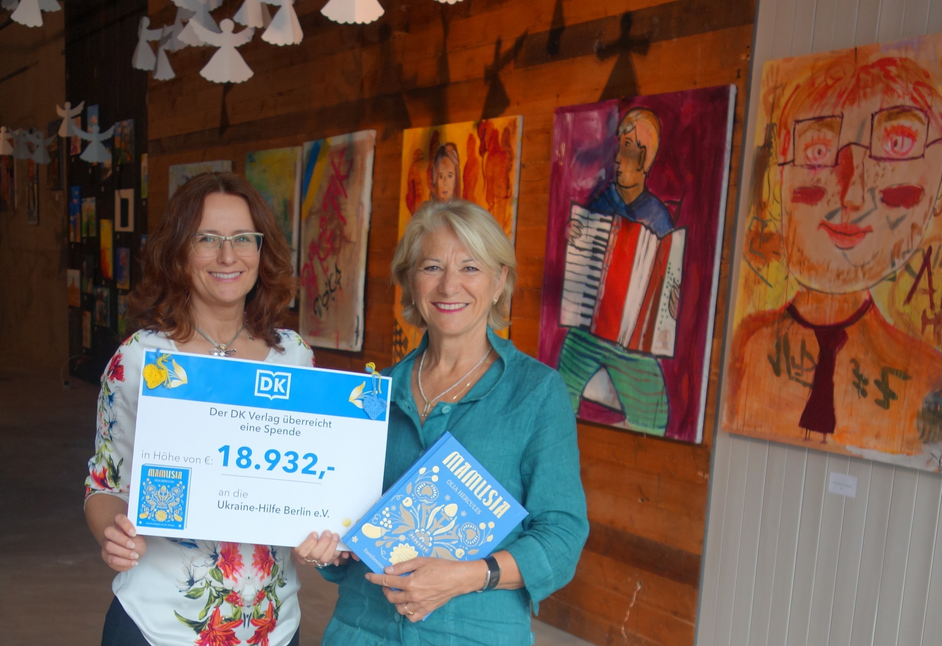 Im Rahmen der von der Ukraine-Hilfe Berlin organisierten Ausstellung "Guck mal, ich zeig dir was!" übergab DK-Verlegerin Monika Schlitzer in Berlin am 6. Oktober den Spendenscheck in Höhe von 18.932 Euro an Tetyana Sell von der Hilfsorganisation.