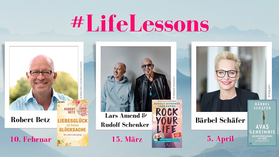 Moderiert von Kulturjournalistin und Bloggerin Karla Paul (Buchkolumne.de) präsentieren Bestsellerautor Robert Betz , das Duo Lars Amend und Rudolf Schenker sowie TV- und Hörfunkmoderatorin Bärbel Schäfer in einstündigen Livestreams ihre Neuerscheinungen. Sie geben Impulse zu den Themen Beziehungsglück, Erfüllung von Lebensträumen und dem Umgang mit Einsamkeit, kündigt die Verlagsgruppe an.